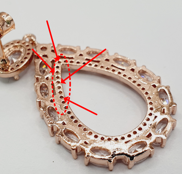 오늘도 비슷한 불량 현상을 목격해서 다시 설명드립니다. 이번에는 큐빅을 사용한 귀걸이에서 발생한 불량인데 불량의 원인은 비슷합니다.