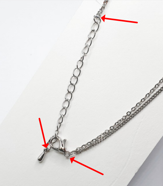 이 부분을 붕어 고리 또는 개고리라고도 하는 데 전체 목걸이를 한 번에 도금을 하는 경우 저 붕어 고리 부분이 붙는 경우가 종종 생기게 됩니다. 저 부분의 틈새도 함께 도금이 되다 보니 서로 붙어서 붕어 고리가 잘 안 열리는 경우가 있습니다.