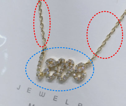 그건 바로 저런 일체형 디자인을 도금을 한 번에 할 경우 빨간색 부분의 체인과 파란색 부분의 펜던트 부분이 같은 도금 두께로 도금이 된다는 것입니다.