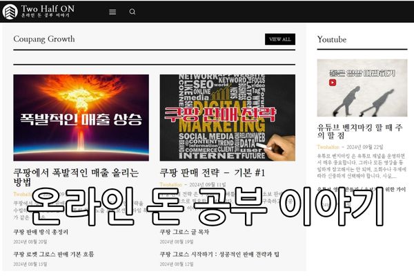 그래서 이번에 새롭게 만든 블로그가 바로 "twohalfon"입니다. 온라인에서 돈에 대해 공부하는 이야기를 담아내기 위해 만든 이 블로그에서는 여러분과 함께 돈에 대한 공부, 사업을 발전시키는 방법, 그리고 개인적으로 성장을 도모할 수 있는 여러 가지 방법들을 나누고자 합니다.