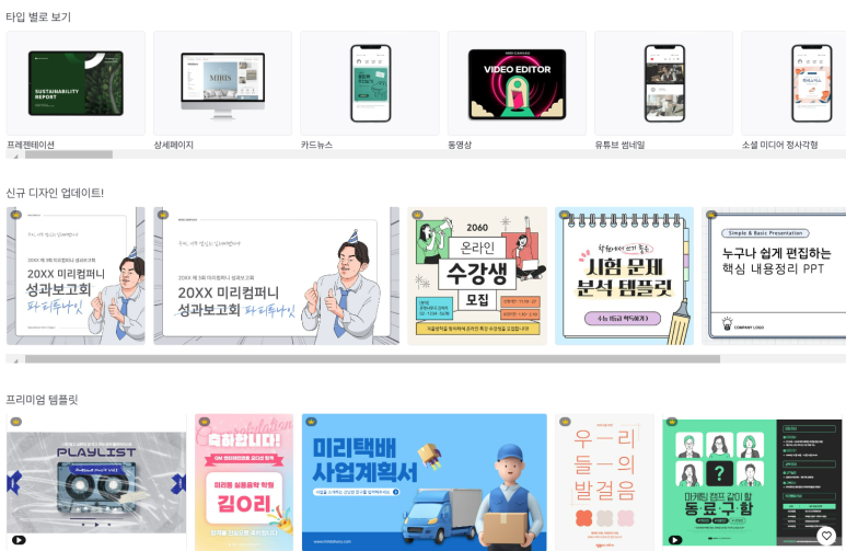 저는 Canva라는 서비스가 미리 캔버스보다는 훨씬 디자인이 감각적이고 훨씬 더 다양한 기능이 있다고 생각됩니다.