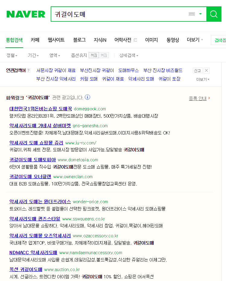 위 검색 결과를 보면 도매쿡, 도매 토피아, 오너 클랜...등 웬만한 공산품들은 다 파는 도매 종합몰이라 귀걸이, 목걸이, 반지…등 액세서리 도매랑 조금 거리가 멉니다.
