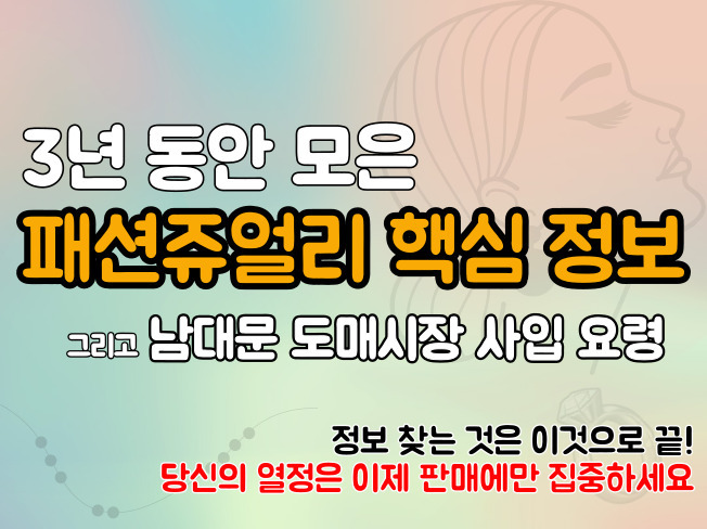 그래서 그동안의 고민과 경험을 글로 적어서 패션 쥬얼리 판매를 준비하고 계신 분들이나 현재 판매를 하는 분들에게 시간과 열정 소비를 줄여줄 수 있는 핵심 정보를 드리고자 합니다.